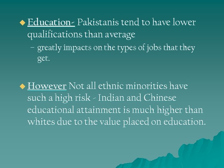 u Education- Pakistanis tend to have lower qualifications than average – greatly impacts on the types of jobs that they get. u However Not all ethnic minorities have such a high risk - Indian and Chinese educational attainment is much higher than whites due to the value placed on education.