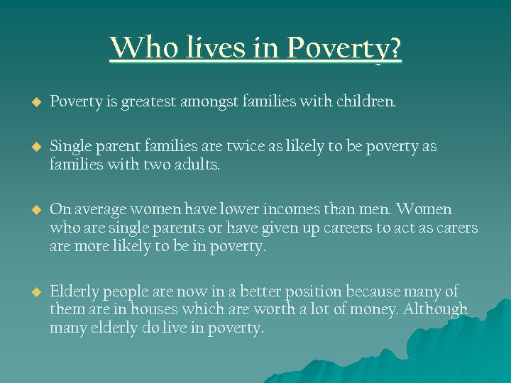 Who lives in Poverty? u Poverty is greatest amongst families with children. u Single parent families are twice as likely to be poverty as families with two adults. u On average women have lower incomes than men. Women who are single parents or have given up careers to act as carers are more likely to be in poverty. u Elderly people are now in a better position because many of them are in houses which are worth a lot of money. Although many elderly do live in poverty.