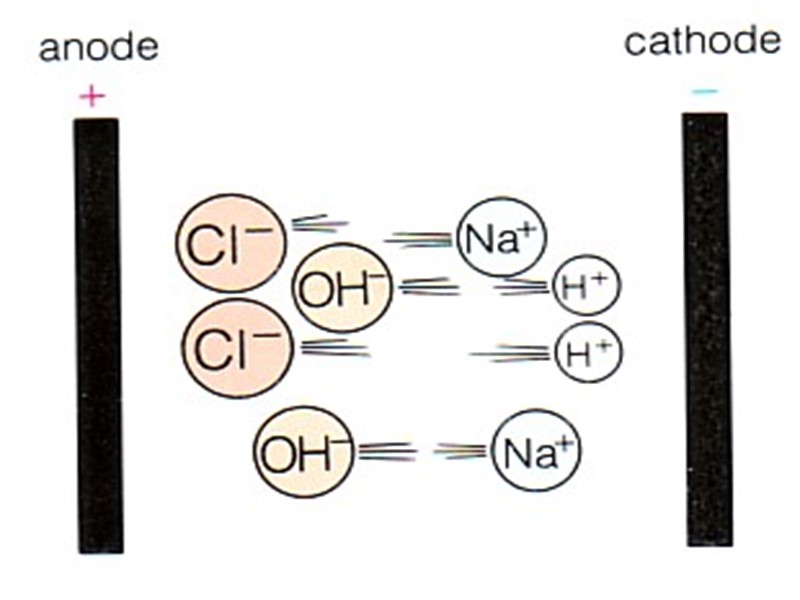 Electrolysis of brine The Na+ and OH- ions stay in solution. They join together to form sodium hydroxide. This is a very important alkali