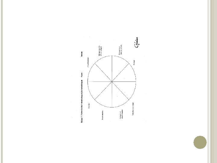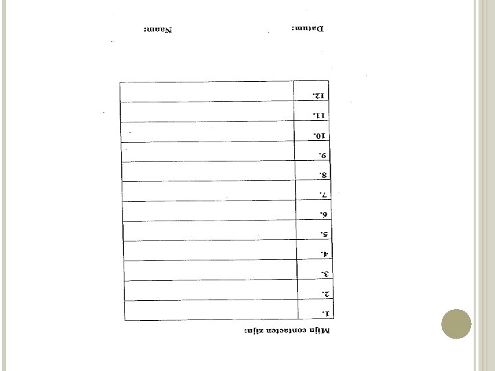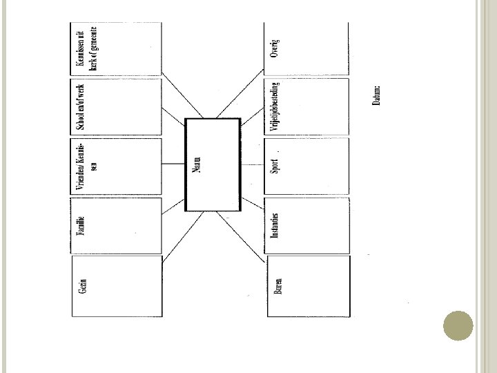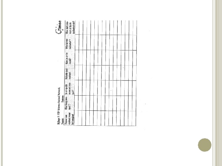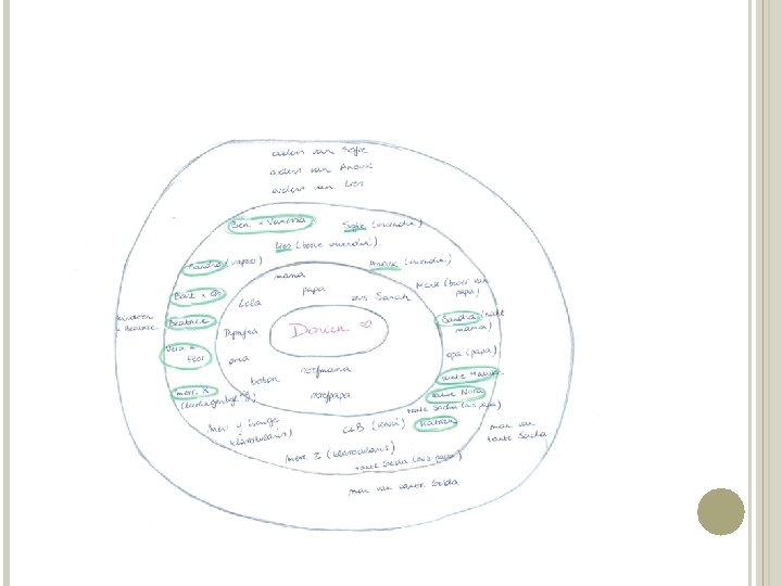 INLEEFOEFENING - Neem een blad en schrijf namen op die je bedenkt bij de volgende vragen: Welke mensen staan bovenaan je oproeplijst op je GSM? Welke drie mensen zouden je als eerste komen bezoeken als je onverwacht in het ziekenhuis belandt? Van wie heb je zaken geleerd die nu nog belangrijk zijn in uw leven? Wie zie je weinig, maar staat wel klaar voor u? Met wie ben je laatst op vakantie geweest? Op wie ben je het vaakst boos? Wie bel je als je verdrietig bent? Wie van je vrienden of familie heb je zelf laatst geholpen? Je hebt een ernstige diagnose gekregen, wie mag dit weten? Wie (uit je privé) weet dat je vandaag vorming hebt over Sof. S?