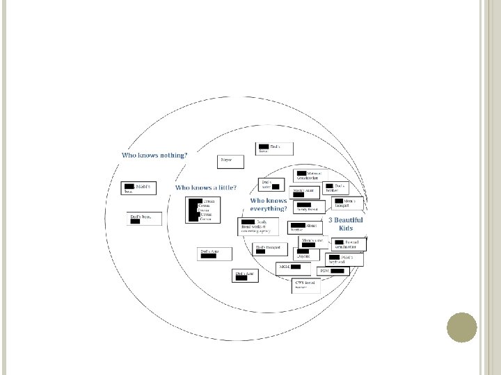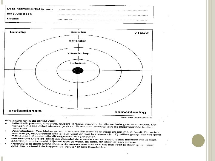 1 NETWERKCIRKELS • • • Instrument doorheen de verschillende fasen van de begeleiding Zicht krijgen op netwerk: wie leeft er allemaal rond mensen? Inschatten van netwerk: ordenen van mensen naargelang veiligheid Betrekken van netwerk: meewerken van mensen aan een veiligheidsplan