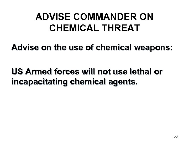ADVISE COMMANDER ON CHEMICAL THREAT Advise on the use of chemical weapons: US Armed forces will not use lethal or incapacitating chemical agents. 33