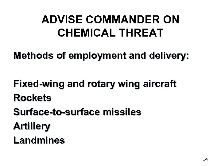 ADVISE COMMANDER ON CHEMICAL THREAT Methods of employment and delivery: Fixed-wing and rotary wing aircraft Rockets Surface-to-surface missiles Artillery Landmines 34