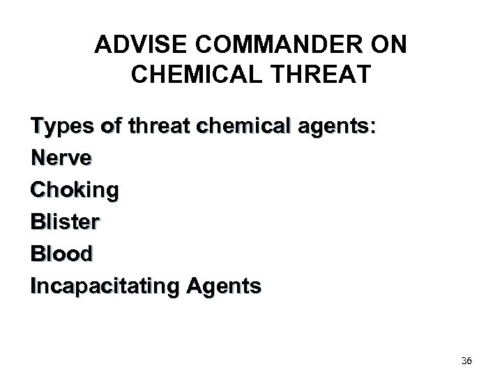 ADVISE COMMANDER ON CHEMICAL THREAT Types of threat chemical agents: Nerve Choking Blister Blood Incapacitating Agents 36