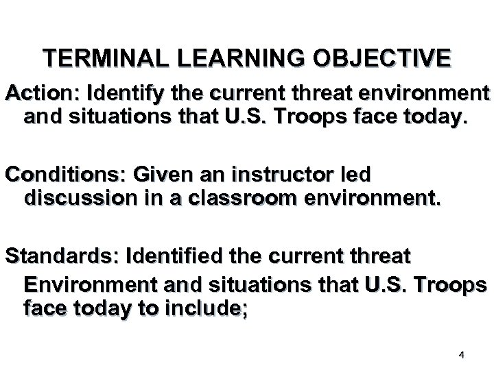 TERMINAL LEARNING OBJECTIVE Action: Identify the current threat environment and situations that U. S. Troops face today. Conditions: Given an instructor led discussion in a classroom environment. Standards: Identified the current threat Environment and situations that U. S. Troops face today to include; 4