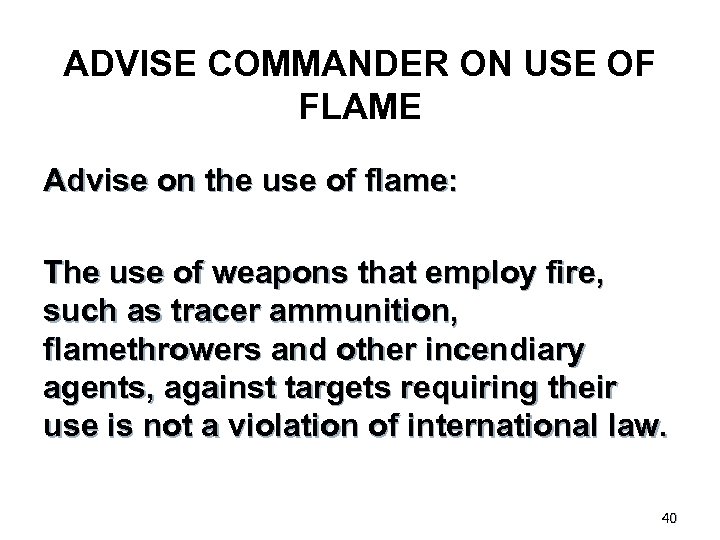 ADVISE COMMANDER ON USE OF FLAME Advise on the use of flame: The use of weapons that employ fire, such as tracer ammunition, flamethrowers and other incendiary agents, against targets requiring their use is not a violation of international law. 40