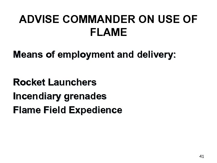 ADVISE COMMANDER ON USE OF FLAME Means of employment and delivery: Rocket Launchers Incendiary grenades Flame Field Expedience 41