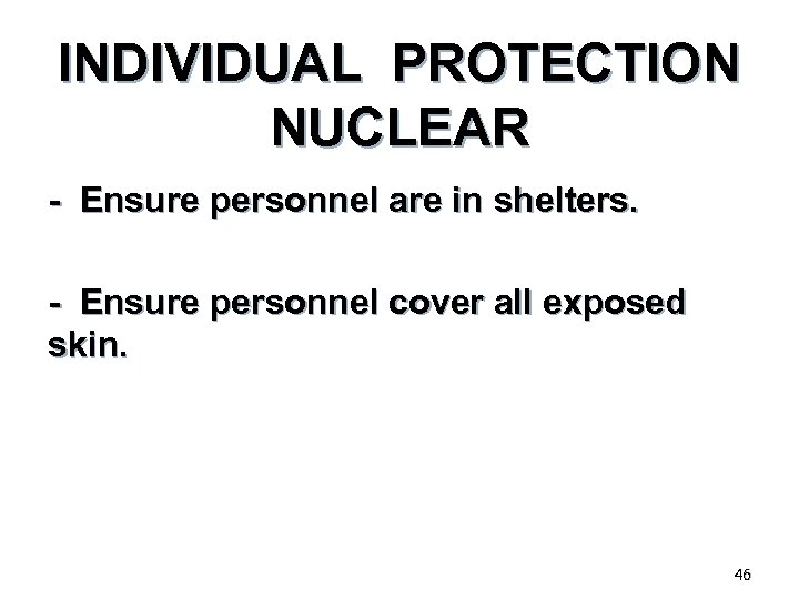 INDIVIDUAL PROTECTION NUCLEAR - Ensure personnel are in shelters. - Ensure personnel cover all exposed skin. 46