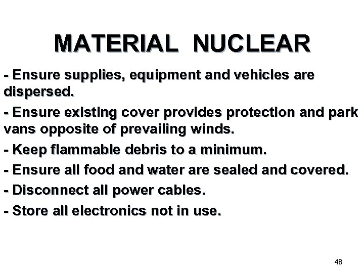 MATERIAL NUCLEAR - Ensure supplies, equipment and vehicles are dispersed. - Ensure existing cover provides protection and park vans opposite of prevailing winds. - Keep flammable debris to a minimum. - Ensure all food and water are sealed and covered. - Disconnect all power cables. - Store all electronics not in use. 48