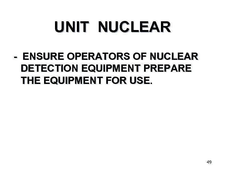 UNIT NUCLEAR - ENSURE OPERATORS OF NUCLEAR DETECTION EQUIPMENT PREPARE THE EQUIPMENT FOR USE. 49