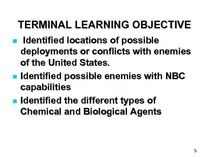 TERMINAL LEARNING OBJECTIVE n n n Identified locations of possible deployments or conflicts with enemies of the United States. Identified possible enemies with NBC capabilities Identified the different types of Chemical and Biological Agents 5