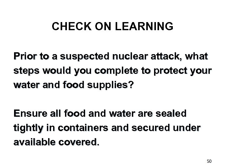 CHECK ON LEARNING Prior to a suspected nuclear attack, what steps would you complete to protect your water and food supplies? Ensure all food and water are sealed tightly in containers and secured under available covered. 50