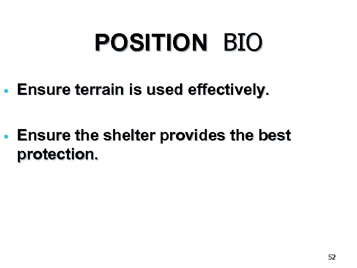 POSITION BIO § Ensure terrain is used effectively. § Ensure the shelter provides the best protection. 52