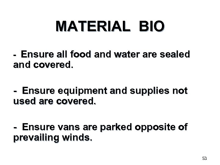 MATERIAL BIO - Ensure all food and water are sealed and covered. - Ensure equipment and supplies not used are covered. - Ensure vans are parked opposite of prevailing winds. 53