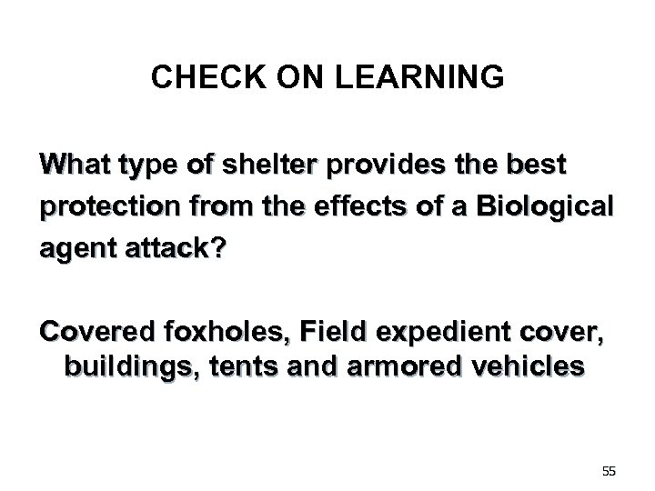 CHECK ON LEARNING What type of shelter provides the best protection from the effects of a Biological agent attack? Covered foxholes, Field expedient cover, buildings, tents and armored vehicles 55