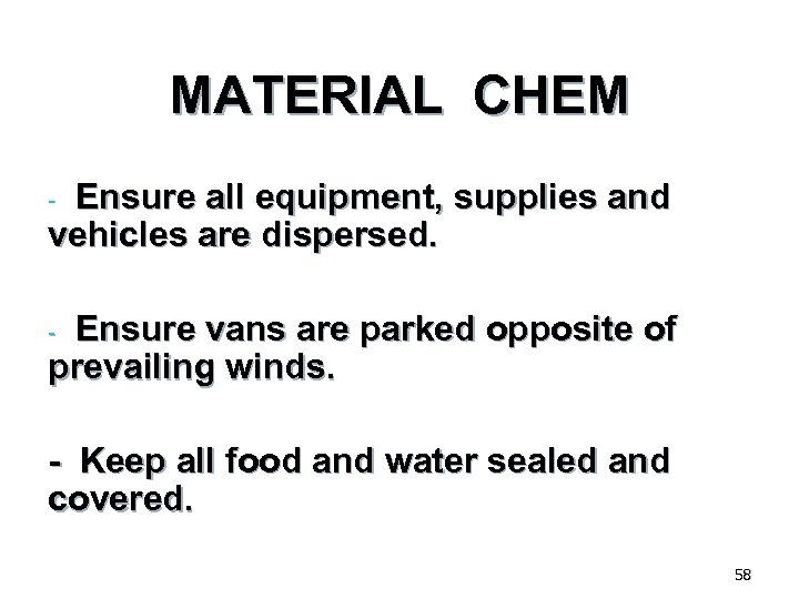 MATERIAL CHEM - Ensure all equipment, supplies and vehicles are dispersed. - Ensure vans are parked opposite of prevailing winds. - Keep all food and water sealed and covered. 58
