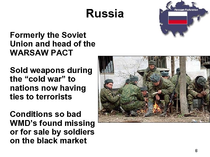 Russia • Formerly the Soviet Union and head of the WARSAW PACT • Sold weapons during the “cold war” to nations now having ties to terrorists • Conditions so bad WMD’s found missing or for sale by soldiers on the black market 8