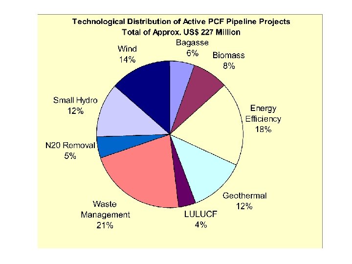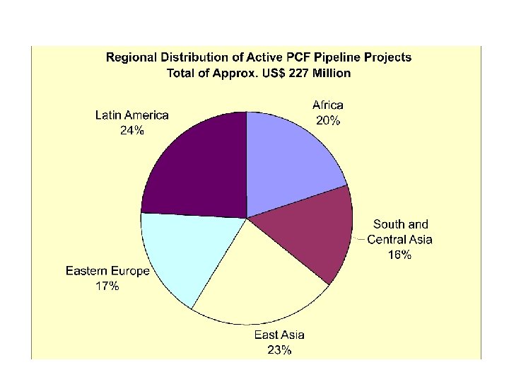 Sample Projects • Latvia: $2. 5 million PCF Purchase – anaerobic decomposition of about 20, 000 tons of garbage a year – ERs from the existing landfill site gas recovery began June 2002 • Uganda: $3. 9 million PCF purchase – a 5. 1 MW and 1. 5 MW small hydro generating facilities in the West Nile region – Displaces >200 small and few large public diesel gensets • Chile: $6 m PCF Purchase – 26 MW run-of-river hydro generating 175 GWh to replace coal/gas • Brazil: $5 mm of PCF Purchase – Substituting coal/coke by sustainably produced charcoal in pig iron production, plus afforestation and ecosystem restoration, biodiversity and health benefits
