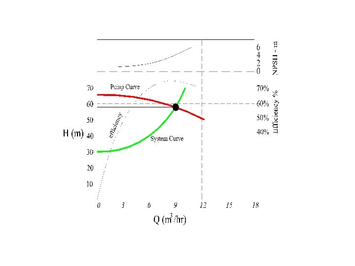 Pump Curves Operating Point Pump A cannot meet the needs of the system at any flow rate Pump B supplies enough head over part of the system curve The shaded area is the area where the pump supplies excess head