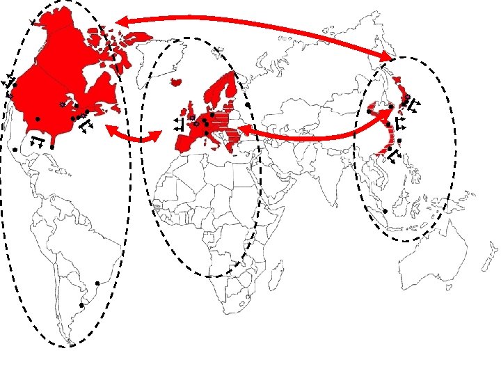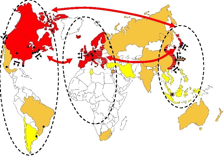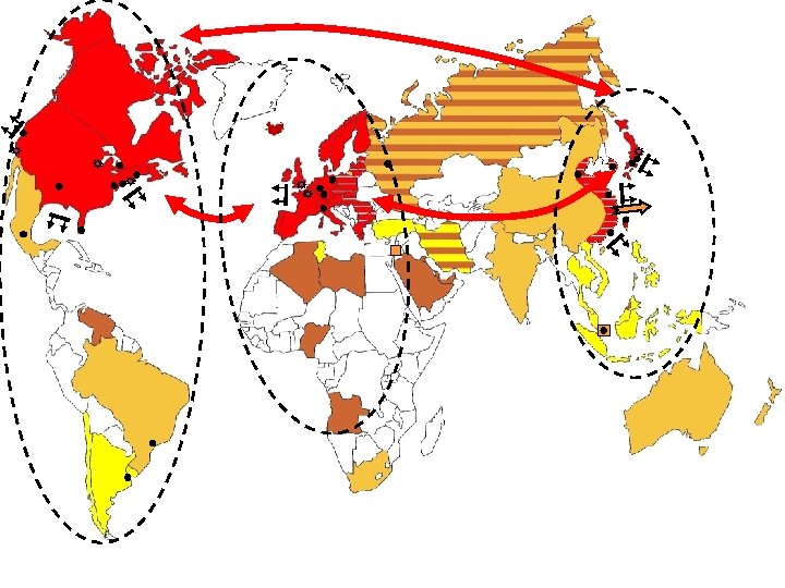 Trois centres majeurs et leurs relais : Les pays de la Triade : régions les plus développées et les plus puissantes, maîtrisant les technologies les plus élaborées, possédant les grandes FTN. Intégration en cours de l’Europe de l’Est et de l’Asie orientale (NPIA). Villes-monde et principales autres métropoles aux activités d’excellence. Façades maritimes majeures, interfaces entre les mégalopoles et le monde. Interrelations entre les trois centres : flux intenses de marchandises, de capitaux, d’informations. Zone d’influence privilégiée de chaque centre de la Triade (flux internes nombreux)