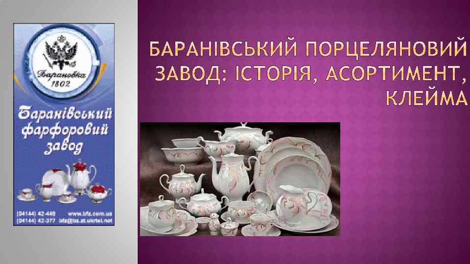 1802 -2011 рр. Адрес: Украина, 12700, Житомирская обл. , Барановка, Ленина ул. , 55 Директор – КУЛАКЕВИЧ Виктор Арсентиевич тел/факс: +38 041 444 -24 -87 Секретарь – тел/факс: +38 041 444 -24 -65