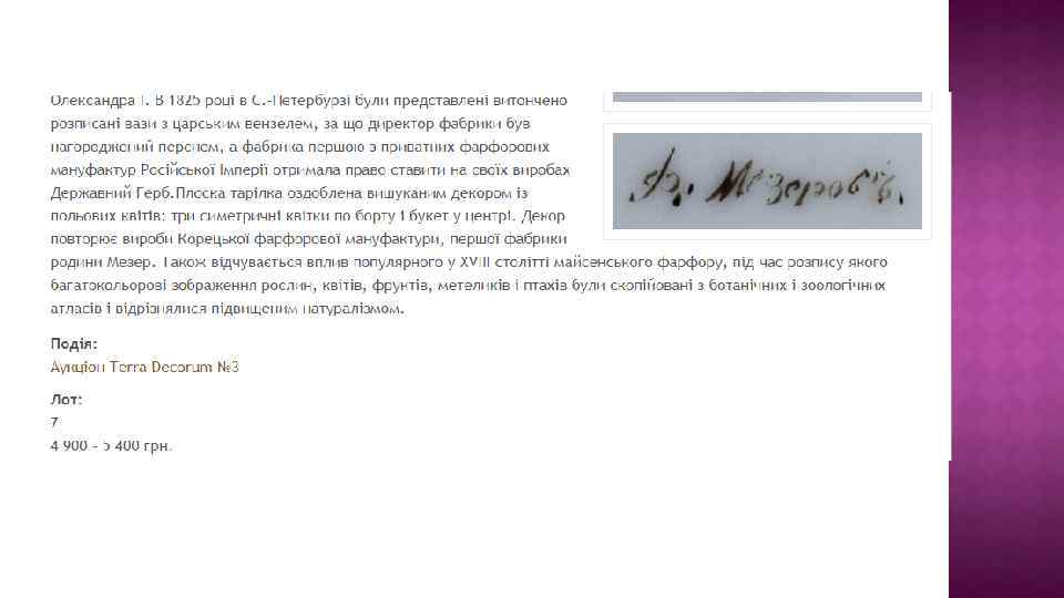 Товари/Послуги : Посуд фарфоро-фаянсовий Сервізи їдальні фарфорофаянсовые і майолікові Сервізи чайні Статуетки Компанія експортувала товари в наступні країни: Грузія Італія Молдова Польща Росія