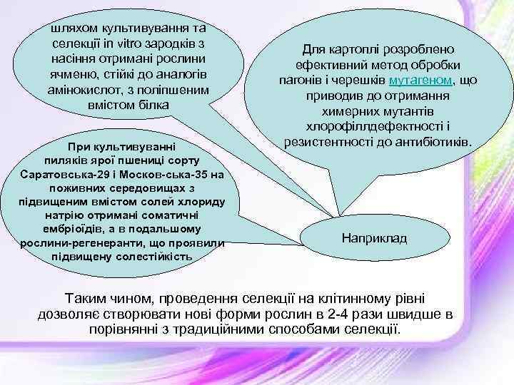 шляхом культивування та селекції in vitro зародків з насіння отримані рослини ячменю, стійкі до аналогів амінокислот, з поліпшеним вмістом білка При культивуванні пиляків ярої пшениці сорту Саратовська-29 і Москов-ська-35 на поживних середовищах з підвищеним вмістом солей хлориду натрію отримані соматичні ембріоїдів, а в подальшому рослини-регенеранти, що проявили підвищену солестійкість Для картоплі розроблено ефективний метод обробки пагонів і черешків мутагеном, що приводив до отримання химерних мутантів хлорофіллдефектності і резистентності до антибіотиків. Наприклад Таким чином, проведення селекції на клітинному рівні дозволяє створювати нові форми рослин в 2 -4 рази швидше в порівнянні з традиційними способами селекції.