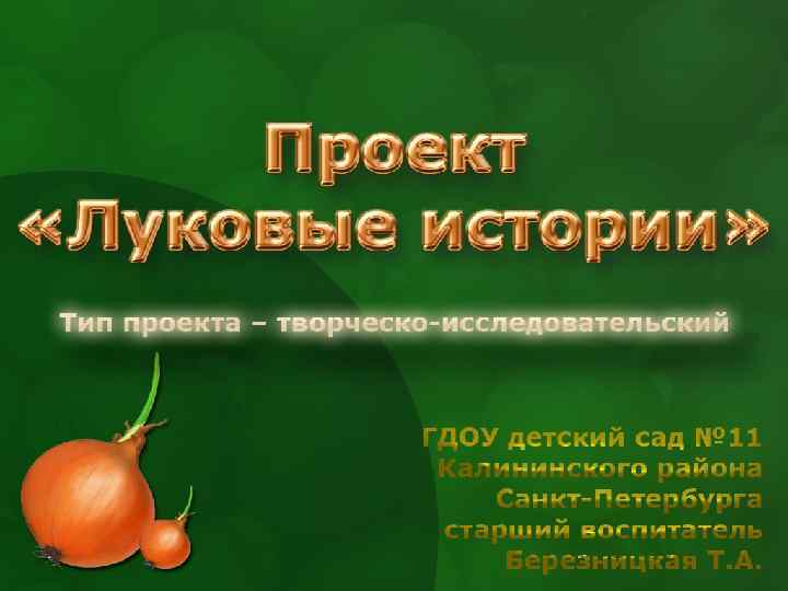 Цель: 1. Активизация творческого потенциала педагогов ДОУ 2. Формирование у детей предпосылок поисковой деятельности Задачи: 1. Развивать у детей познавательный интерес, желание наблюдать, исследовать, получать новые знания 2. Воспитывать у детей желание заботиться о своем здоровье 3. Вызвать интерес к конкретному объекту – луку 4. Способствовать развитию творчества дошкольников