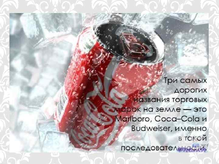 ИНТЕРЕСНЫЕ ФАКТЫ. Огромный знак «Кока-колы» , размещённый над павильоном «Мир Кока Колы» в Атланте, состоит из 1407 обычных лампочек и 1906 «погонных» неоновых ламп. Высота знака — 9 метров, ширина — 8 метров, вес — 12, 5 тонн. Coca-Cola — самый продолжительный спонсор Олимпийских Игр. Сотрудничество Coca-Cola с Олимпийским движением началось с 1928 года. Самый большой знак «Кока-Колы» расположен в чилийском городе Арека. Он установлен на вершине холма. Ширина знака — 122 метра, высота — 40 метров. Он составлен из 70 тысяч бутылочек от «Кока-Колы» . Первый наружный рекламный щит «Кока-Колы» , нарисованный ещё в 1904 году, до сих пор находится на своём месте в городке Картерсвилл (штат Джорджия)