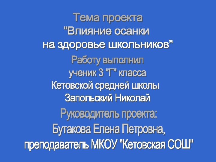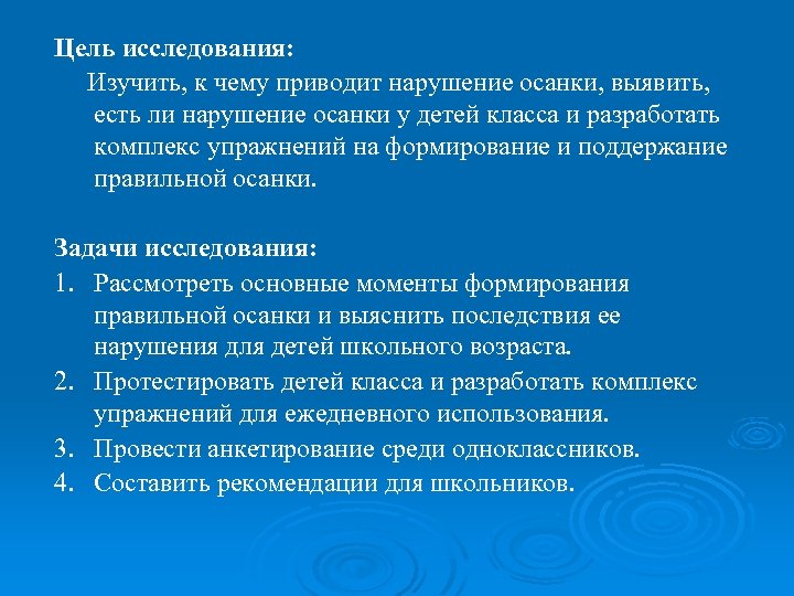 Цель исследования: Изучить, к чему приводит нарушение осанки, выявить, есть ли нарушение осанки у детей класса и разработать комплекс упражнений на формирование и поддержание правильной осанки. Задачи исследования: 1. Рассмотреть основные моменты формирования правильной осанки и выяснить последствия ее нарушения для детей школьного возраста. 2. Протестировать детей класса и разработать комплекс упражнений для ежедневного использования. 3. Провести анкетирование среди одноклассников. 4. Составить рекомендации для школьников.