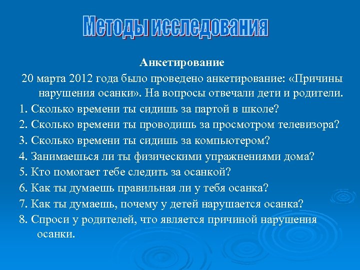 Анкетирование 20 марта 2012 года было проведено анкетирование: «Причины нарушения осанки» . На вопросы отвечали дети и родители. 1. Сколько времени ты сидишь за партой в школе? 2. Сколько времени ты проводишь за просмотром телевизора? 3. Сколько времени ты сидишь за компьютером? 4. Занимаешься ли ты физическими упражнениями дома? 5. Кто помогает тебе следить за осанкой? 6. Как ты думаешь правильная ли у тебя осанка? 7. Как ты думаешь, почему у детей нарушается осанка? 8. Спроси у родителей, что является причиной нарушения осанки.