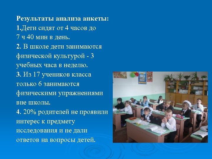 Результаты анализа анкеты: 1. Дети сидят от 4 часов до 7 ч 40 мин в день. 2. В школе дети занимаются физической культурой - 3 учебных часа в неделю. 3. Из 17 учеников класса только 6 занимаются физическими упражнениями вне школы. 4. 20% родителей не проявили интерес к предмету исследования и не дали ответов на вопросы детей.