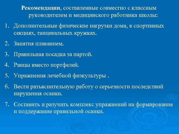 Рекомендации, составленные совместно с классным руководителем и медицинского работника школы: 1. Дополнительные физические нагрузки дома, в спортивных секциях, танцевальных кружках. 2. Занятия плаванием. 3. Правильная посадка за партой. 4. Ранцы вместо портфелей. 5. Упражнения лечебной физкультуры. 6. Вести разъяснительную работу о серьезности последствий нарушения осанки. 7. Составить и разучить комплекс упражнений на формирование и поддержание правильной осанки.