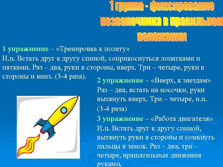 1 упражнение – «Тренировка к полету» И. п. Встать друг к другу спиной, соприкоснуться лопатками и пятками. Раз – два, руки в стороны, вверх. Три – четыре, руки в стороны и вниз. (3 -4 раза). 2 упражнение – «Вверх, к звездам» Раз – два, встать на носочки, руки вытянуть вверх. Три – четыре, и. п. (3 -4 раза) 3 упражнение – «Работа двигателя» И. п. Встать друг к другу спиной, вытянуть руки в стороны и сомкнуть пальцы в замок. Раз – два, три – четыре, вращательные движения руками.