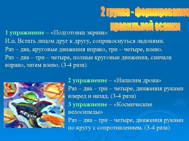 1 упражнение – «Подготовка экрана» И. п. Встать лицом друг к другу, соприкоснуться ладонями. Раз – два, круговые движения вправо, три – четыре, влево. Раз – два – три – четыре, полные круговые движения, сначала вправо, затем влево. (3 -4 раза) 2 упражнение – «Напилим дрова» Раз – два – три – четыре, движения руками вперед и назад. (3 -4 раза) 3 упражнение – «Космические велосипеды» Раз – два – три – четыре, движения руками по кругу с сопротивлением. (3 -4 раза)