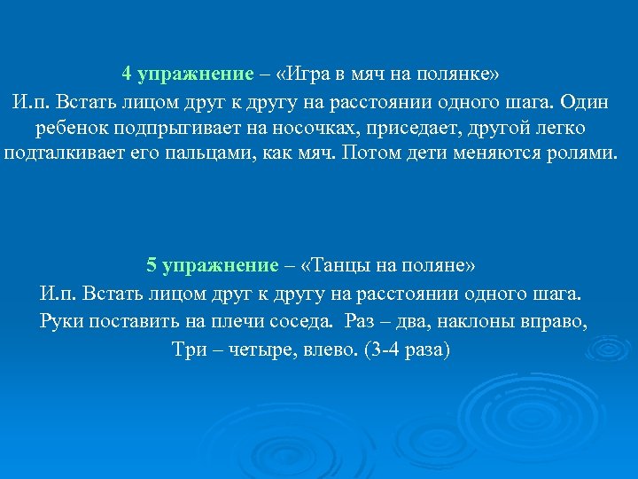 4 упражнение – «Игра в мяч на полянке» И. п. Встать лицом друг к другу на расстоянии одного шага. Один ребенок подпрыгивает на носочках, приседает, другой легко подталкивает его пальцами, как мяч. Потом дети меняются ролями. 5 упражнение – «Танцы на поляне» И. п. Встать лицом друг к другу на расстоянии одного шага. Руки поставить на плечи соседа. Раз – два, наклоны вправо, Три – четыре, влево. (3 -4 раза)