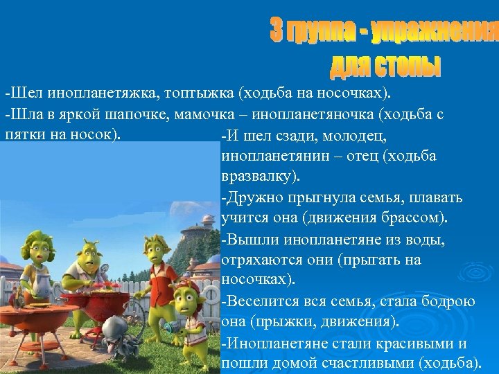 -Шел инопланетяжка, топтыжка (ходьба на носочках). -Шла в яркой шапочке, мамочка – инопланетяночка (ходьба с пятки на носок). -И шел сзади, молодец, инопланетянин – отец (ходьба вразвалку). -Дружно прыгнула семья, плавать учится она (движения брассом). -Вышли инопланетяне из воды, отряхаются они (прыгать на носочках). -Веселится вся семья, стала бодрою она (прыжки, движения). -Инопланетяне стали красивыми и пошли домой счастливыми (ходьба).