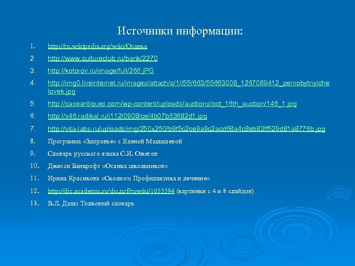 Источники информации: 1. http: //ru. wikipedia. org/wiki/Осанка 2. http: //www. cultureclub. ru/bank/2270 3. http: //kotorov. ru/image/full/266. j. PG 4. http: //img 0. liveinternet. ru/images/attach/c/1//55/663/55663008_1267089412_pervobytnyiche lovek. jpg 5. http: //caseantiques. com/wp-content/uploads/auctions/oct_16 th_auction/146_1. jpg 6. http: //s 46. radikal. ru/i 112/0908/ce/4 b 07 b 63682 d 1. jpg 7. http: //vita-labs. ru/uploads/img/250 x 250/b 9 f 5 c 2 ce 9 a 9 c 2 acd 68 a 4 c 8 eb 83 ff 529 d 81 a 8776 b. jpg 8. Программа «Здоровье» с Еленой Малышевой 9. Словарь русского языка С. И. Ожегов 10. Джесси Банкрофт «Осанка школьников» 11. Ирина Красикова «Сколиоз: Профилактика и лечение» 12. http: //dic. academic. ru/dic. nsf/ruwiki/1055594 (картинки с 4 и 8 слайдов) 13. В. Л. Даль: Толковый словарь