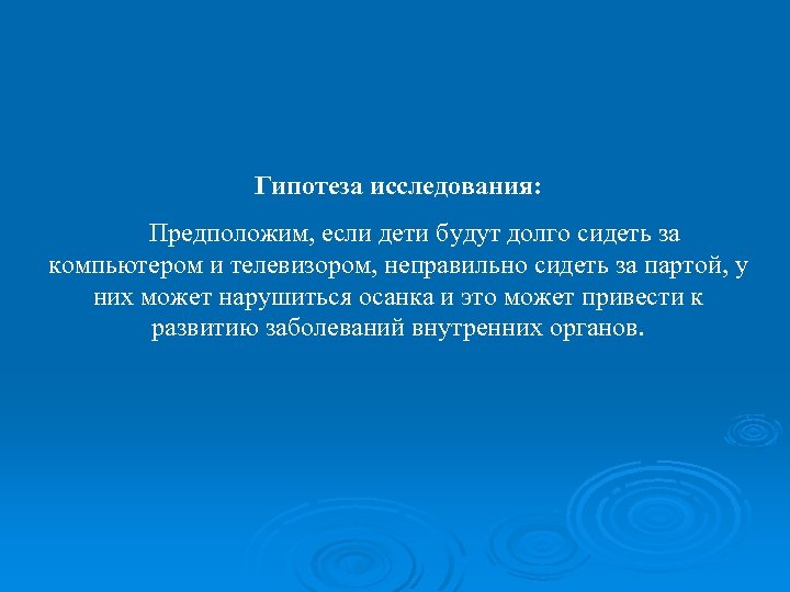 Гипотеза исследования: Предположим, если дети будут долго сидеть за компьютером и телевизором, неправильно сидеть за партой, у них может нарушиться осанка и это может привести к развитию заболеваний внутренних органов.