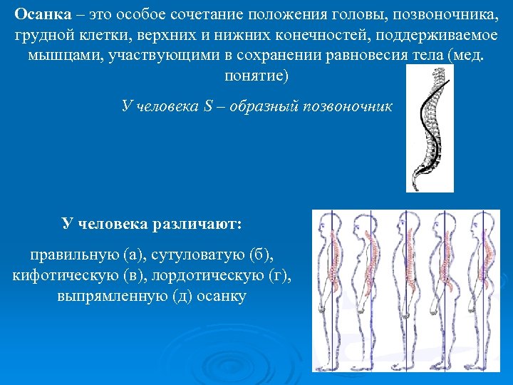 Осанка – это особое сочетание положения головы, позвоночника, грудной клетки, верхних и нижних конечностей, поддерживаемое мышцами, участвующими в сохранении равновесия тела (мед. понятие) У человека S – образный позвоночник У человека различают: правильную (а), сутуловатую (б), кифотическую (в), лордотическую (г), выпрямленную (д) осанку