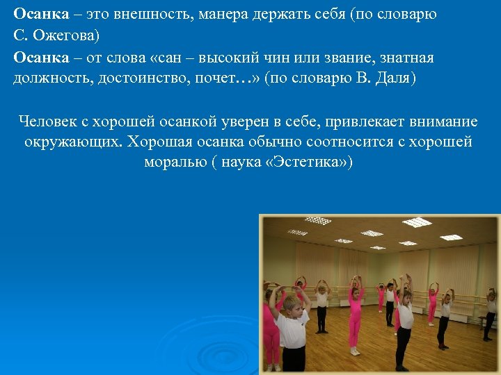 Осанка – это внешность, манера держать себя (по словарю С. Ожегова) Осанка – от слова «сан – высокий чин или звание, знатная должность, достоинство, почет…» (по словарю В. Даля) Человек с хорошей осанкой уверен в себе, привлекает внимание окружающих. Хорошая осанка обычно соотносится с хорошей моралью ( наука «Эстетика» )