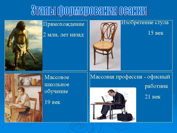 Прямохождение 2 млн. лет назад Массовое школьное обучение 19 век Изобретение стула 15 век Массовая профессия - офисный работник 21 век