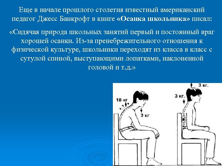 Еще в начале прошлого столетия известный американский педагог Джесс Банкрофт в книге «Осанка школьника» писал: «Сидячая природа школьных занятий первый и постоянный враг хорошей осанки. Из-за пренебрежительного отношения к физической культуре, школьники переходят из класса в класс с сутулой спиной, выступающими лопатками, наклоненной головой и т. д. »