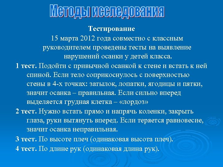 Тестирование 15 марта 2012 года совместно с классным руководителем проведены тесты на выявление нарушений осанки у детей класса. 1 тест. Подойти с привычной осанкой к стене и встать к ней спиной. Если тело соприкоснулось с поверхностью стены в 4 -х точках: затылок, лопатки, ягодицы и пятки, значит осанка – правильная. Если сильно вперед выделяется грудная клетка – «лордоз» 2 тест. Нужно встать прямо и напрячь коленки, закрыть глаза, руки вытянуть вперед. Если теряется равновесие, значит осанка неправильная. 3 тест. По высоте плеч (одинаковая высота плеч). 4 тест. По длине рук (одинаковая длина рук).