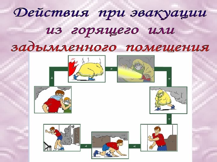 А теперь закрепим то, что мы сегодня узнали. • Вопрос 1. Каковы должны быть ваши действия, если из работающего телевизора или из какого-то другого электроприбора пошёл дым? • Вопрос 2. Чем нельзя тушить электропроводку под напряжением? Почему? • Вопрос 3. Как быть, если загорелся пролитый возле гаража бензин • Вопрос 4. Как правильно вызвать пожарную команду • Вопрос 5. Что делать при сильном задымлении квартиры едким густым дымом? • Вопрос 6. Что необходимо предпринять, если произошла утечка газа в квартире? • Вопрос 7. Каковы пути эвакуации из класса? Допустим, мы находимся: 1) в столовой, 2) в кабинете на втором этаже • Вопрос 8. Что нужно сделать, если человек оказался в зоне пожара, и на нём загорелась одежда? • Вопрос 9. Как оказать первую помощь человеку, получившему термический ожог?