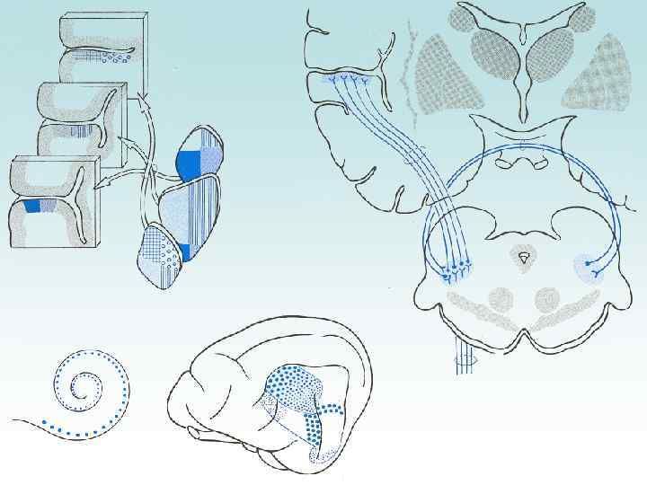 Структурная организация слуховой системы • Подсистема афферентации (специфического отражения сигнала) • Подсистема проведения информации. • Подсистема трансферноинтегративная.