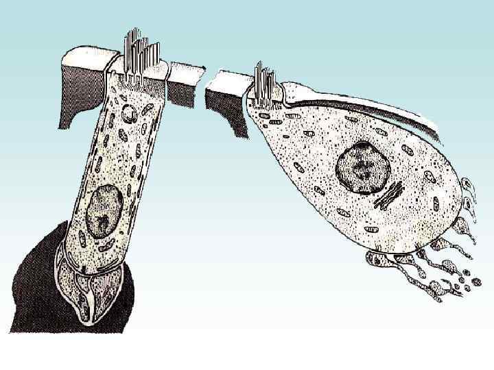 Секреция перилимфы Однослойный плоский эпителий, переходящий в кубический и цилиндрический, лежащий на базальной мембране, под которой находятся пигментосодержащие гранулы меланоцитов и капилляры. К секреторным областям вестибулярной части перепончатого лабиринта в маточке и полукружных каналах относятся области темных клеток, в ампулах - полулунные пластинки и области эпителия. В мешочке секреторную роль играют клетки задневерхней части его стенки, содержащие меланиновые гранулы.