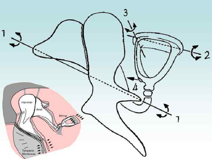 ось вращения membrana tympani малая сила БОЛЬШАЯ АМПЛИТУДА БОЛЬШАЯ СИЛА малая амплитуда