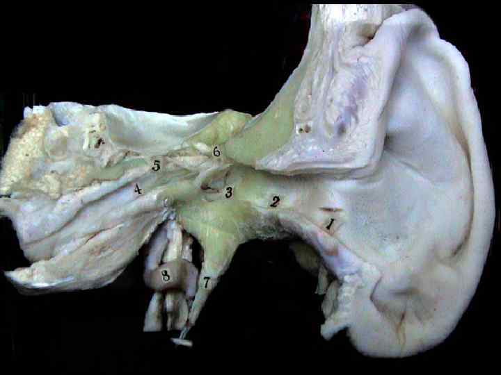 Развитие уха Каждый бугорок ушной раковины формирует характерную порцию дефинитивного наружного уха. Например, 1 – tragus, 6 – antitragus. Исключением является долька уха.