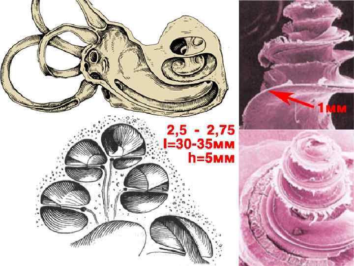 Улитка длина - 35 мм, высота - 5 мм, диаметр у основания - 9 мм; базилярная мембрана: длина - 32 мм, ширина у стремени - 0, 04 мм, у верхушки - 0, 5 мм, толщина: у основания - толще, у верхушки - тоньше